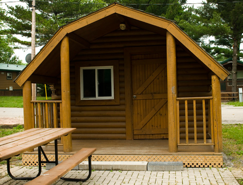 The “Rustic Cabins” are our entry level cabins. Great for the budget conscious family of 4. These 12×12 log cabins are a great tent substitute. Equipped with a double bed and bunk bed with vinyl mattresses. These cabins have lights, electrical outlets, a water source, but do not have a bathroom or kitchen facilities. All rustic cabins have a fire pit, picnic table, covered porch, interlock patio and parking for 1 vehicle. Please note that BEDDING AND TOWELS ARE NOT PROVIDED.